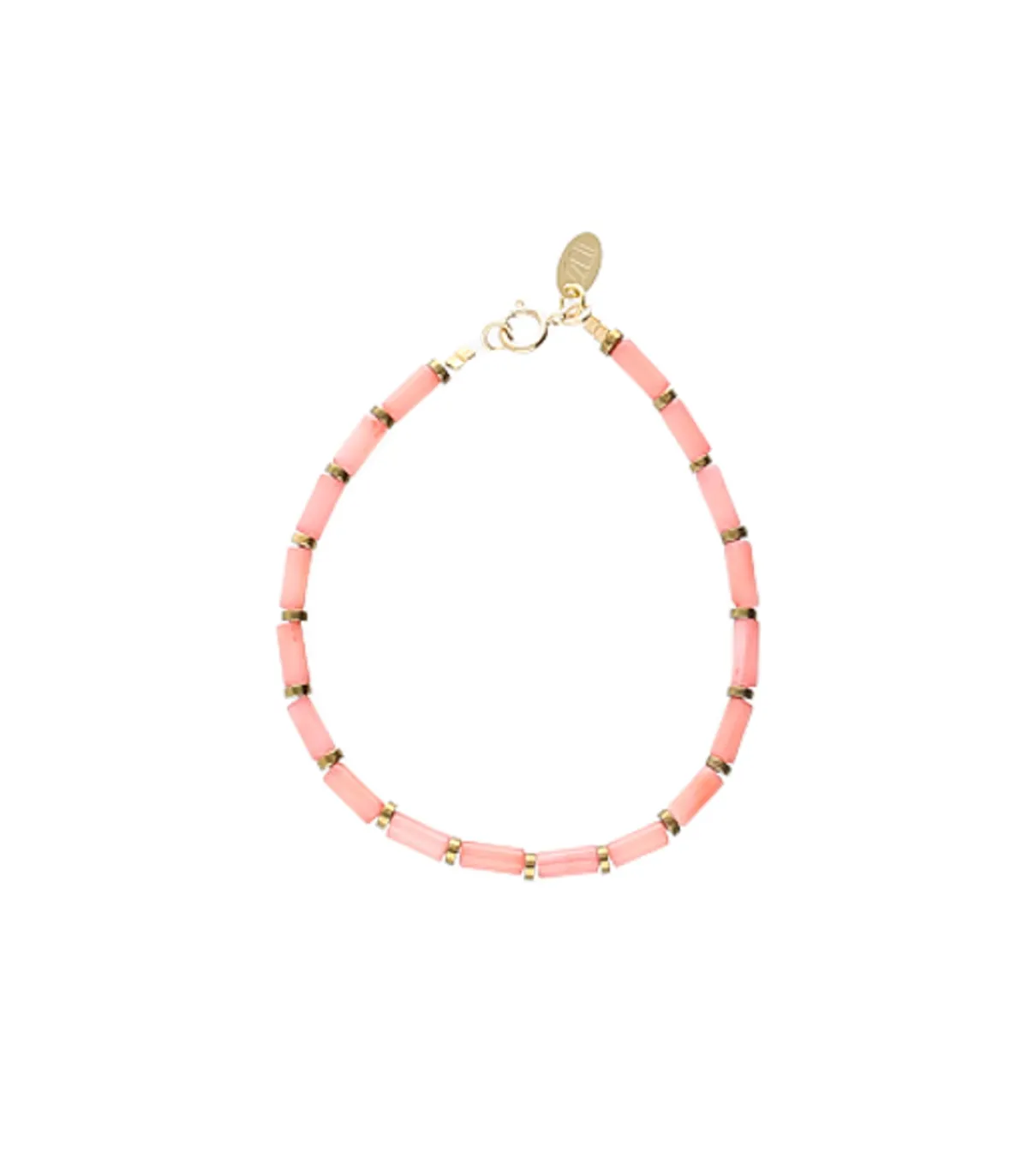 Bracelet Cécile de la marque Maison Mönik. Ce modèle féminin et estival est composé de perles en bambou de mer rose et de quelques perles en hématite pour apporter une touche de couleur à votre poignet.