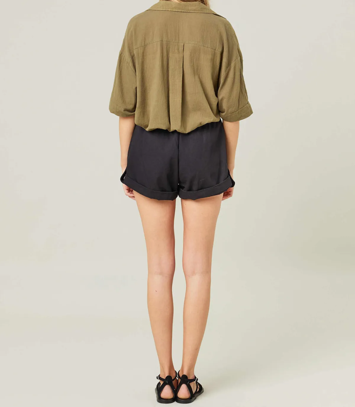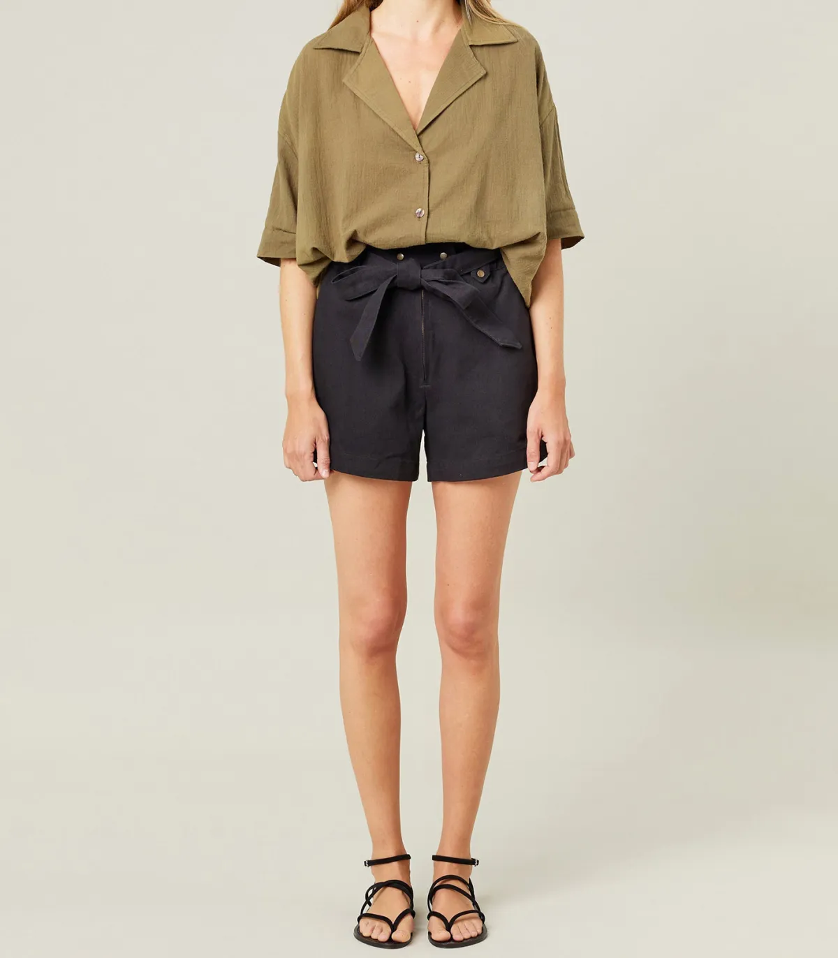 Léger et pratique, le short noir Trench Coat de la marque Maison Julien permet d’être ajusté en longeur grâce à des pattes de boutonnage.