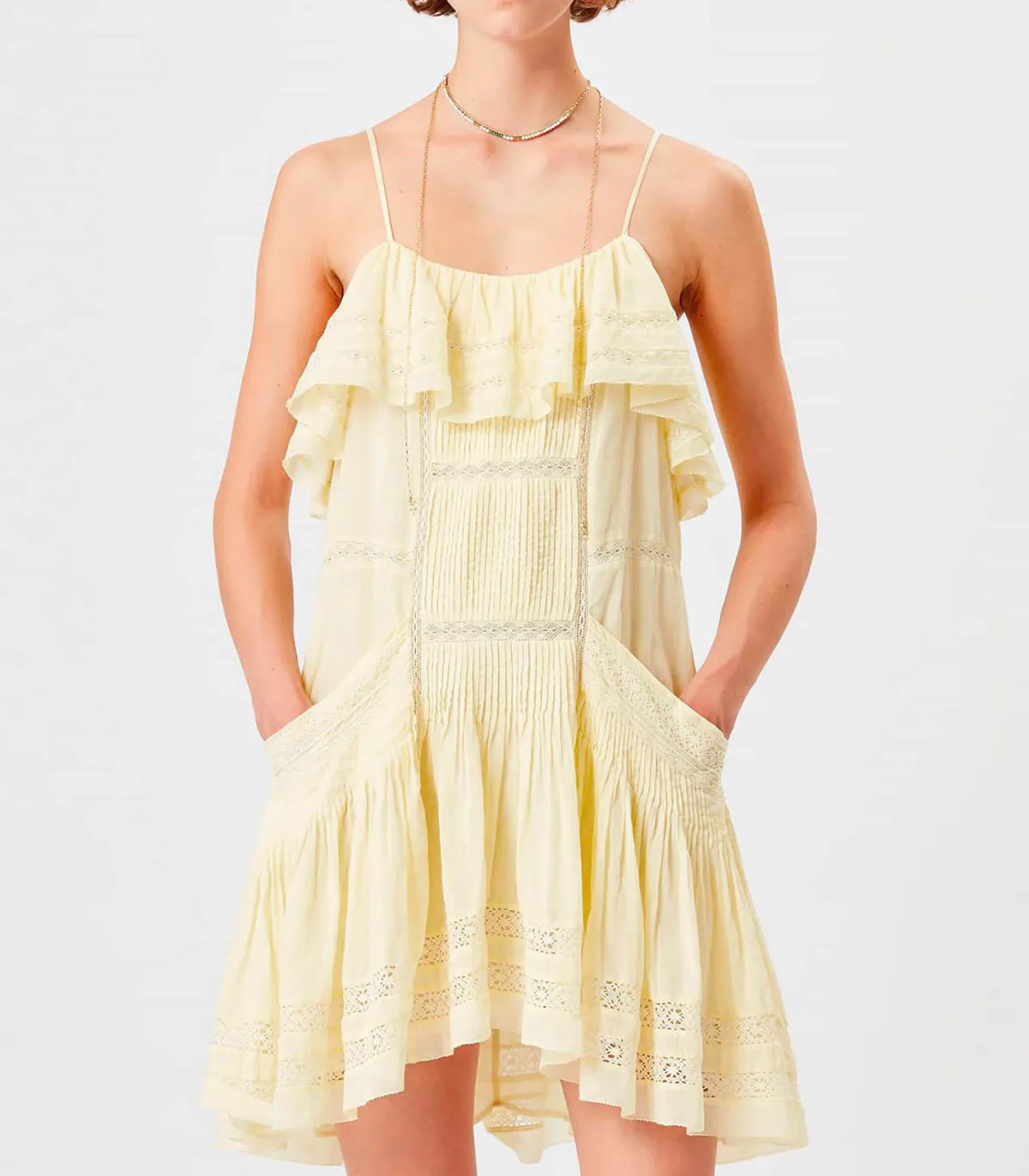 Petite robe d’été en coton Moly Yellow signée Isabel Marant, un modèle trés féminin avec ses bretelles spaghetti, empreint d’un charme bohème avec ses multiples volants et broderies à l’anglaise.