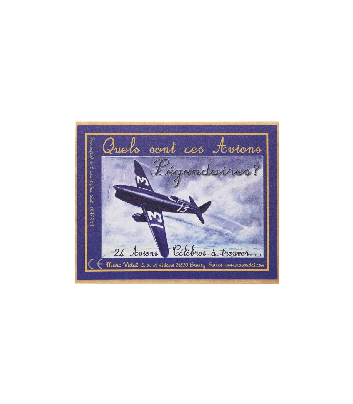 Boîte en carton signée Marc Vidal, contenant des cartes représentant des avions de légende. Un quizz qui retrace les plus grandes histoires de l’aviation, à faire entre amis ou en famille.