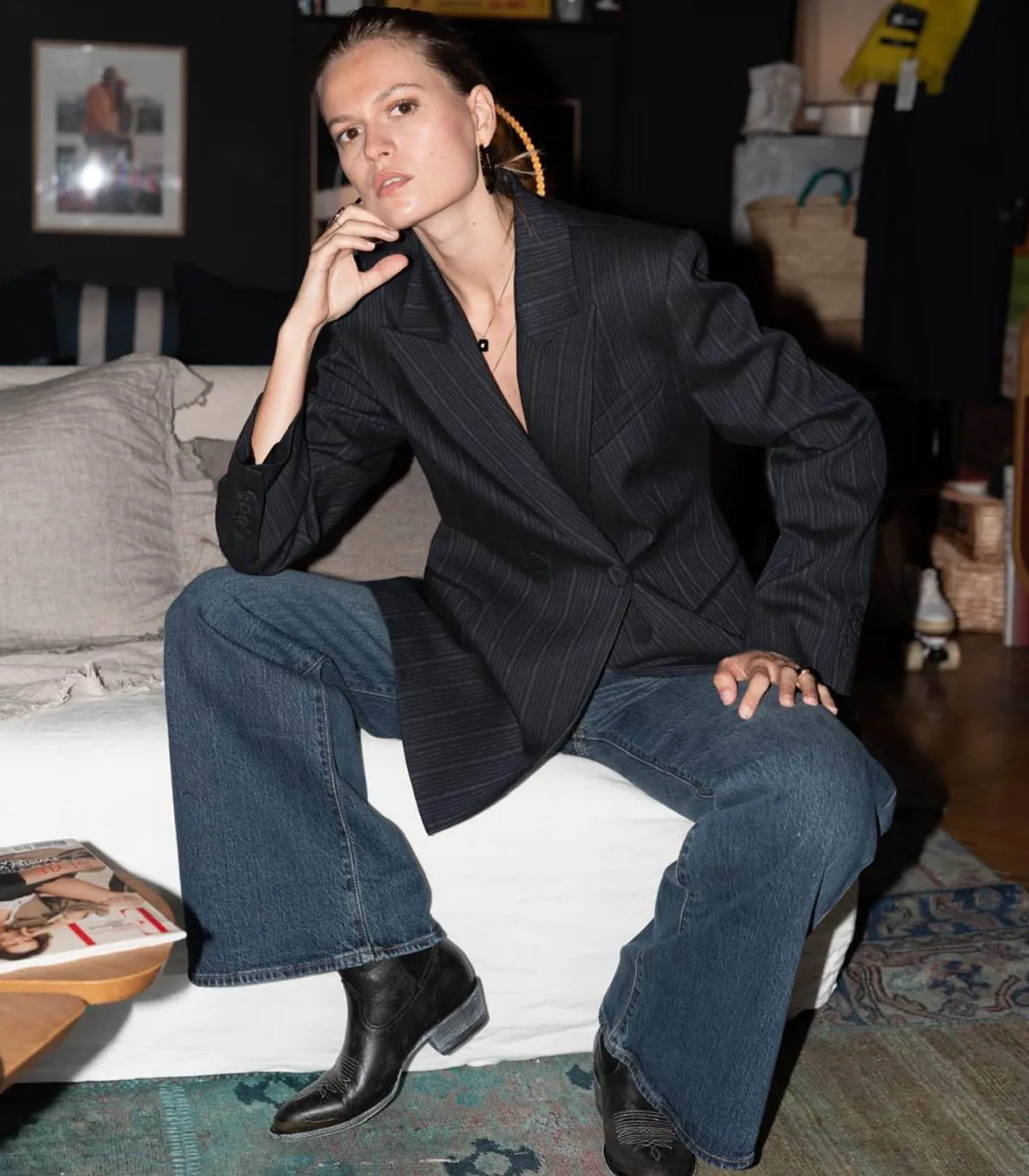 Veste Fairway de la marque Margaux Lonnberg. Ce blazer élégant est croisé et cintré pour une silhouette féminine et structurée. Ses détails soignés et son motif à rayure fine sur toile navy lui confèrent un esprit tailleur et urbain propres aux collections de la maison parisienne.