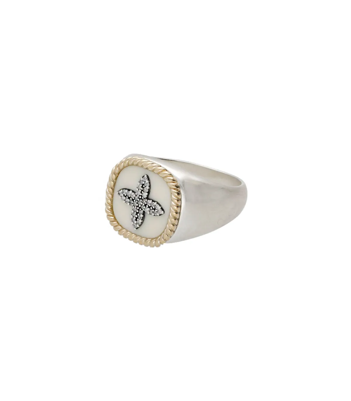 Intemporel de la maison, la Bague Chevalière Bowie Blanc Diamant Pascale Monvoisin est revisitée au masculin en version chevalière, avec une plaque de bakélite blanche incrustée d’un motif en diamants.