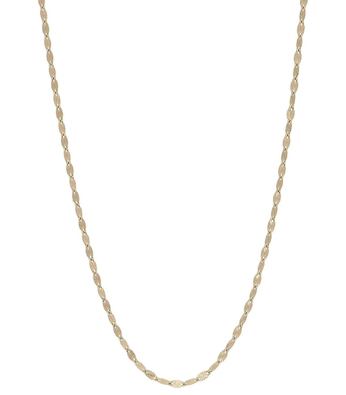 La chaîne Comporta N°1 de Pascale Monvoisin remet au goût du jour les maillons guillochés. Cette forme spéciale confère un look vintage à cette chaîne en or jaune 14 carats, de 41 cm de long.