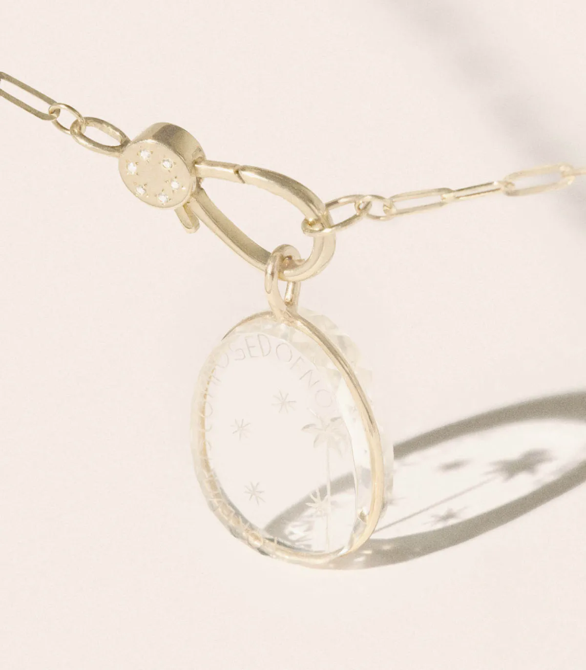 Plus audacieux que l’Alba n°1, ce collier revisite l’iconique cristal avec une chaîne large en or jaune 9 carats, à la présence magnétique. Le pendentif, gravé à la main d’un palmier, s’illumine de diamants subtils, éclats d’éternité posés sur le cristal. La citation d’Emily Dickinson « Forever is composed of nows » y résonne comme un mantra précieux. Un bijou signature, entre puissance et poésie.