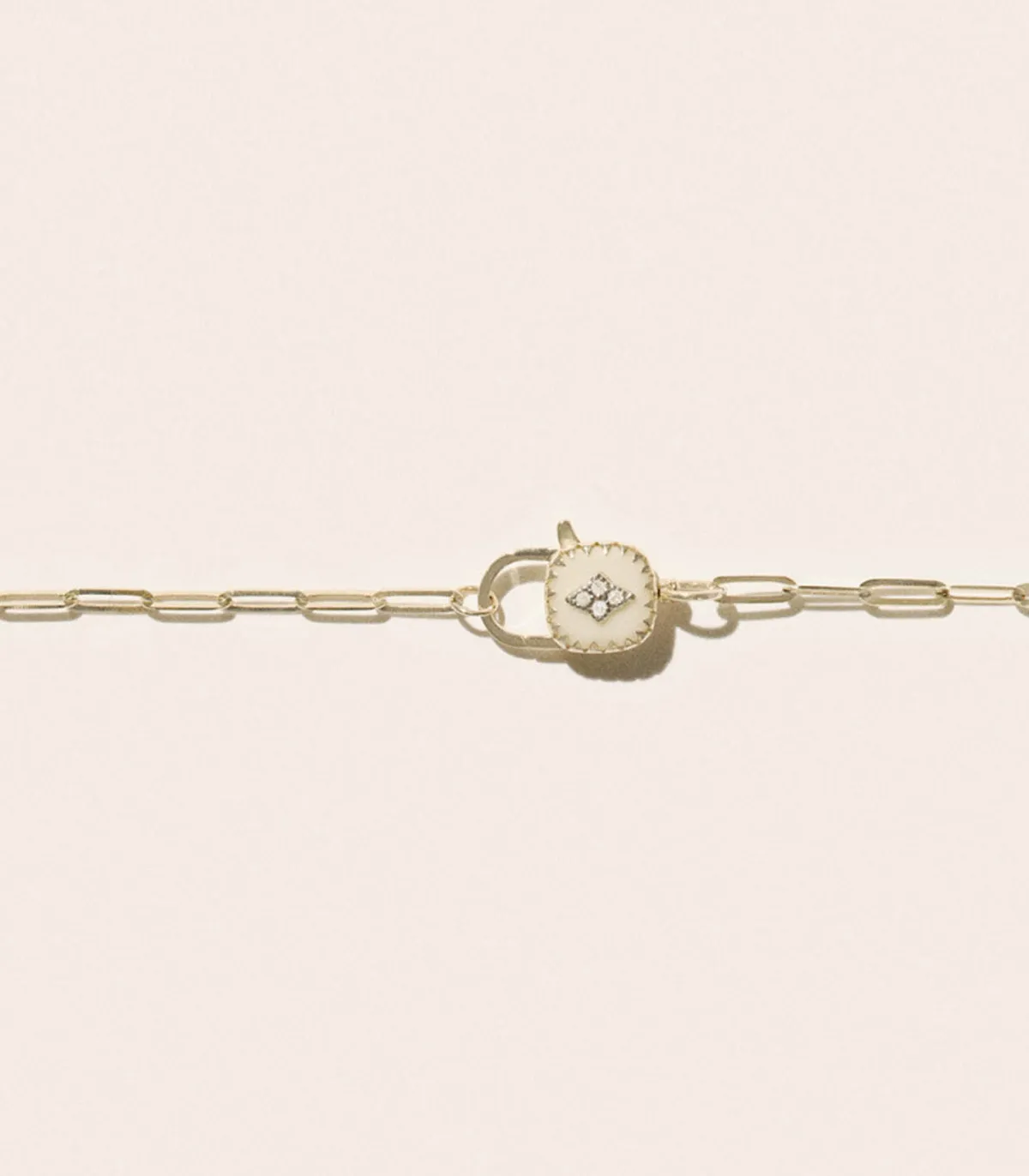 Collier Ginger Blanc signé Pascale Monvoisin. Cette collection revisite le dessin emblématique de la collection Pierrot, mêlant l’allure vintage du bijou à une chaîne plus contemporaine. Le fermoir, transformé en un cadenas minimaliste, devient un détail design et fonctionnel, symbole de liens à réinventer.