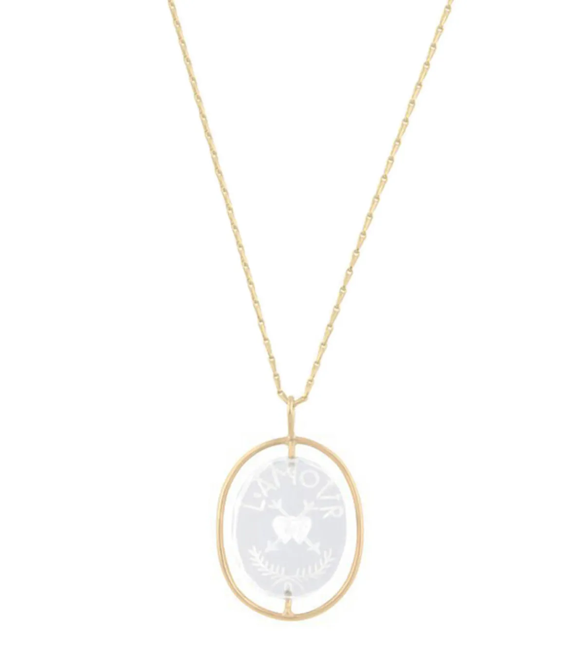 Le collier L’Amour n° 1 Cristal est un bijou raffiné et romantique, dessiné par Pascale Monvoisin. Ses inspirations bohèmes s’allient avec les matières raffinées, or jaune 9 carats et cristal. Le pendentif est gravé de l’inscription L’AMOUR et de deux cœurs percés d’une flèche et de feuillage.