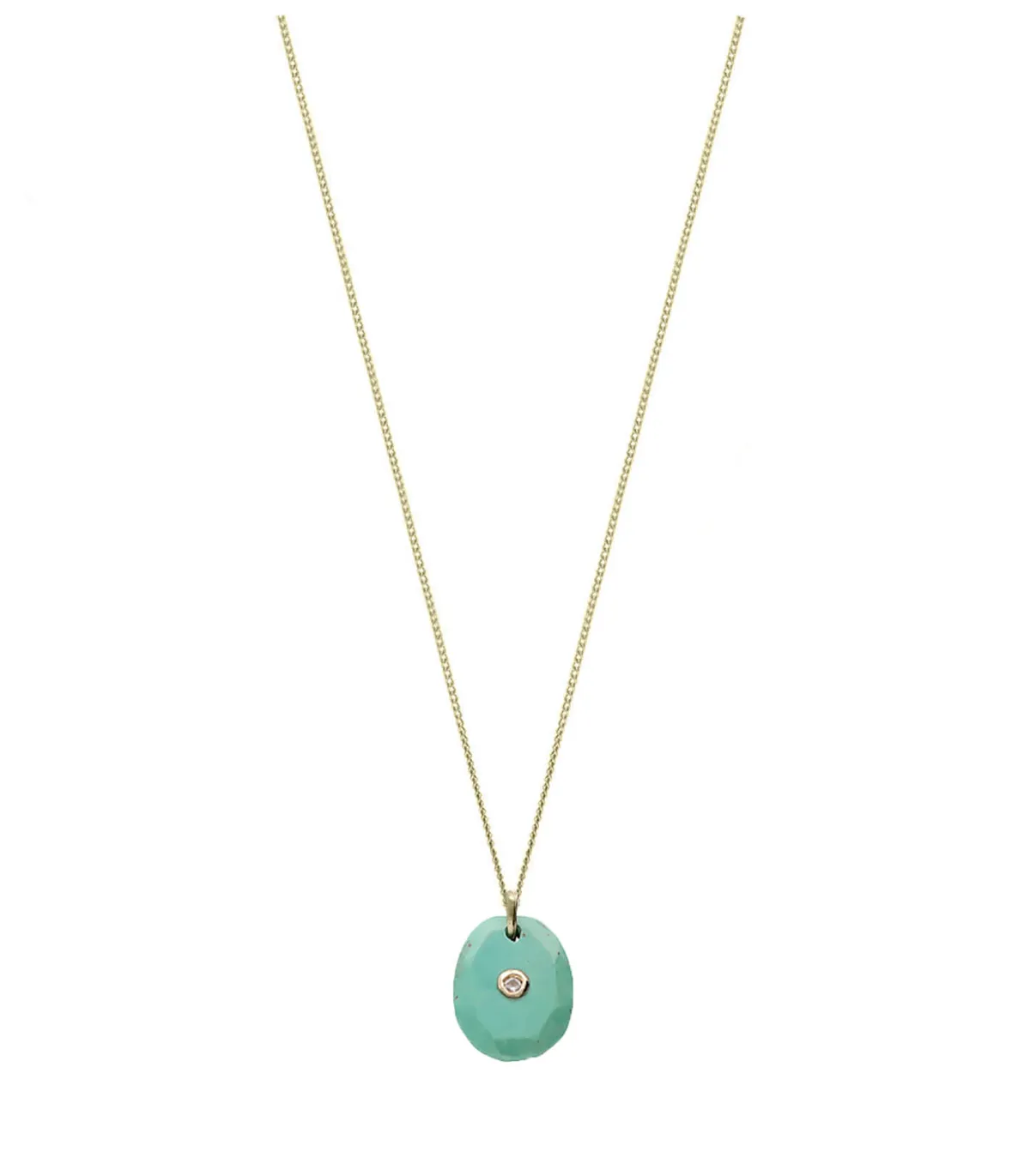 Collier ras de cou Orso en version Turquoise par Pascale Monvoisin. Une élégante turquoise taillée et sertie d’un diamant vient habiller le cou d’une délicate touche précieuse, suspendue à une discrète chaîne en or.