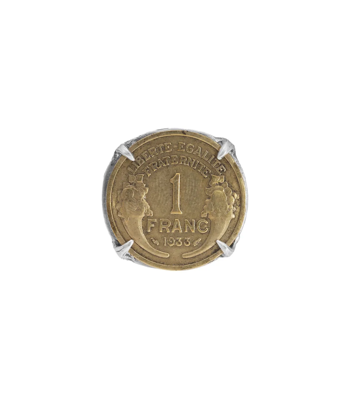 Bague pièce « 1 Franc » de la marque de bijoux Roc Paris. Ce bijou fait main est constitué d’un anneau en argent 925 surmonté d’un plateau dans lequel est incrusté une pièce authentique de un franc Morlon des années 30.