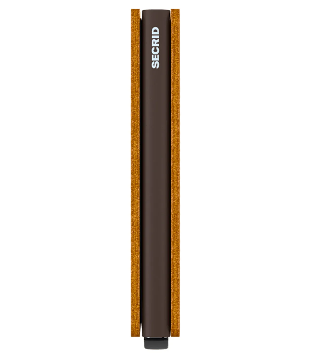 Porte-Carte Slimwallet Vintage Ochre Secrid en cuir vieilli ocre intérieur et extérieur, boitier en alluminium chocolat foncé, moderne et élégant, il accueille vos billets et reçus, ainsi que 4 cartes avec relief, et 6 cartes lisse. L’étui protège contre la casse et la fraude.