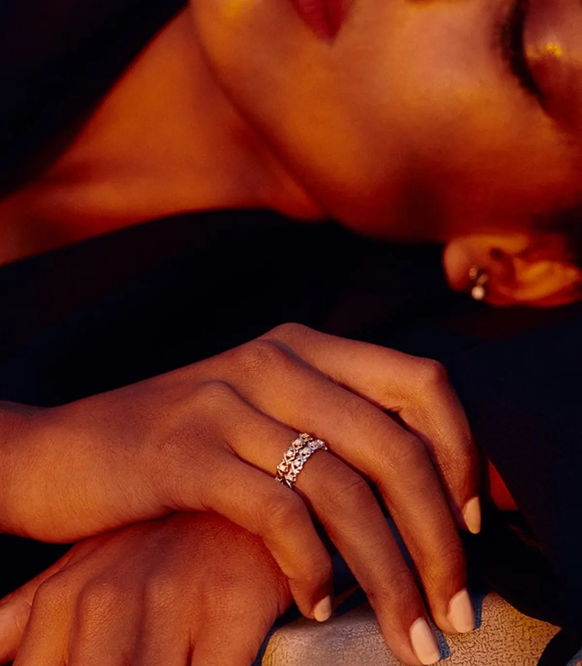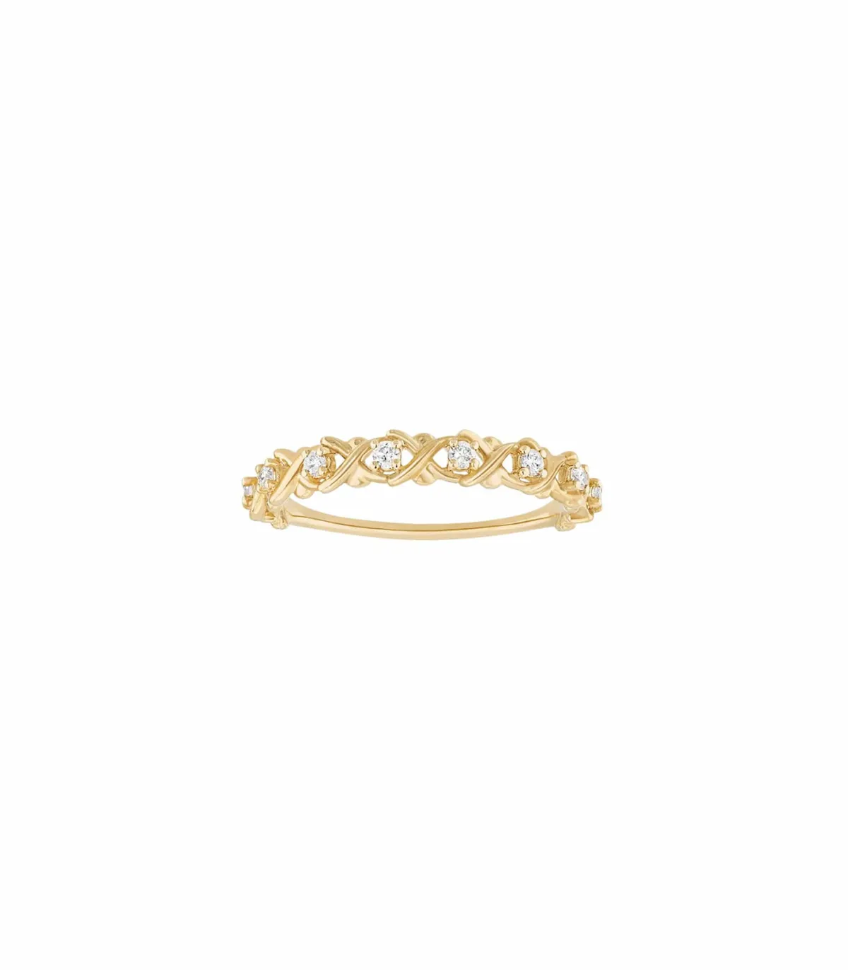 Bague simple Dunaway de la maison Stone Paris, en or jaune lumineux et chaud. Un anneau dont le dessus et agrémenté de motifs entrecroisés et sertis de petits diamants blancs, pour un design original inspiré d’un diadème.