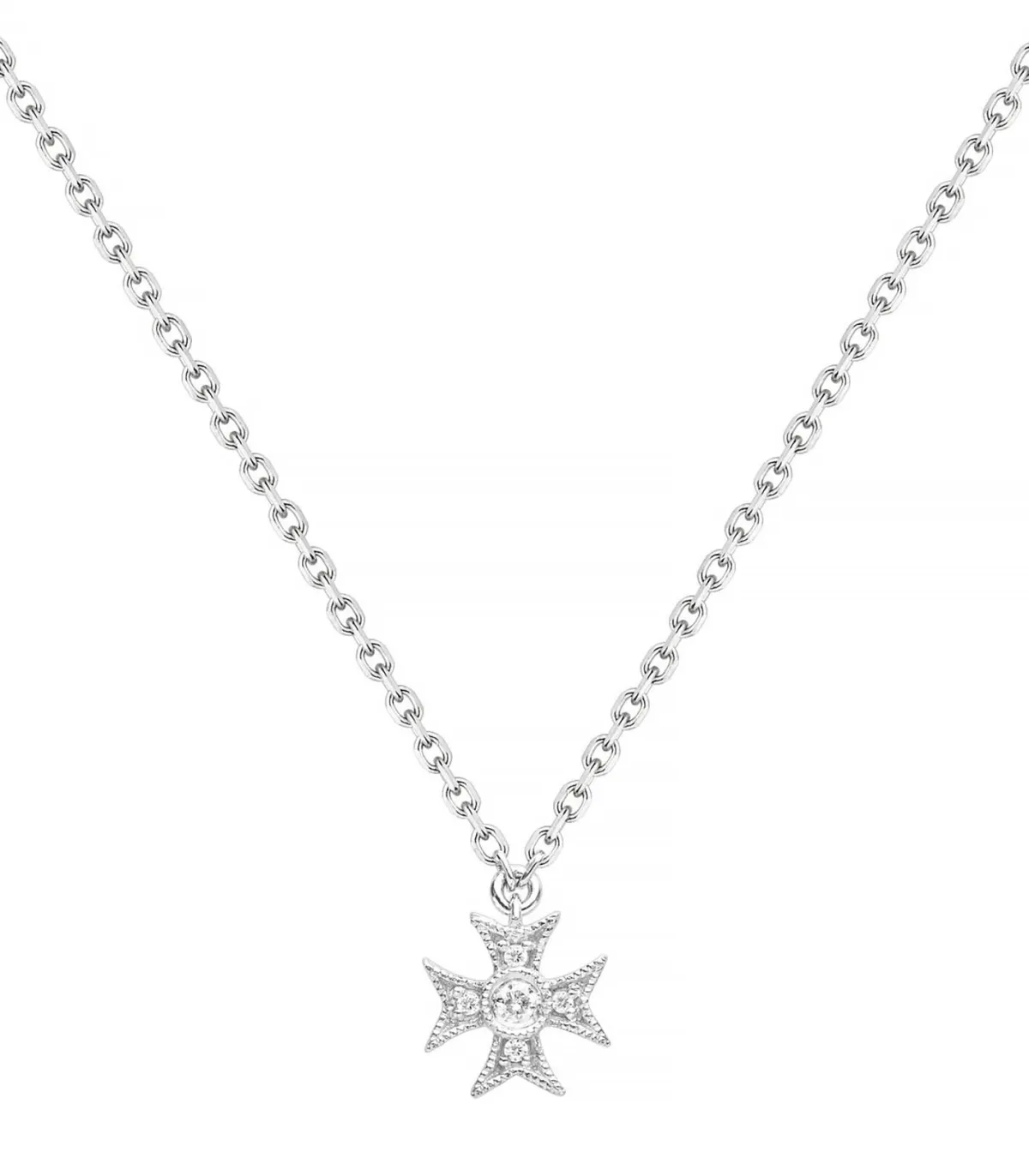 un motif à l’inspiration ancienne décliné en collier et une petite croix de Malte que l’on retrouve sur un collier, un bracelet et des boucles d’oreilles.