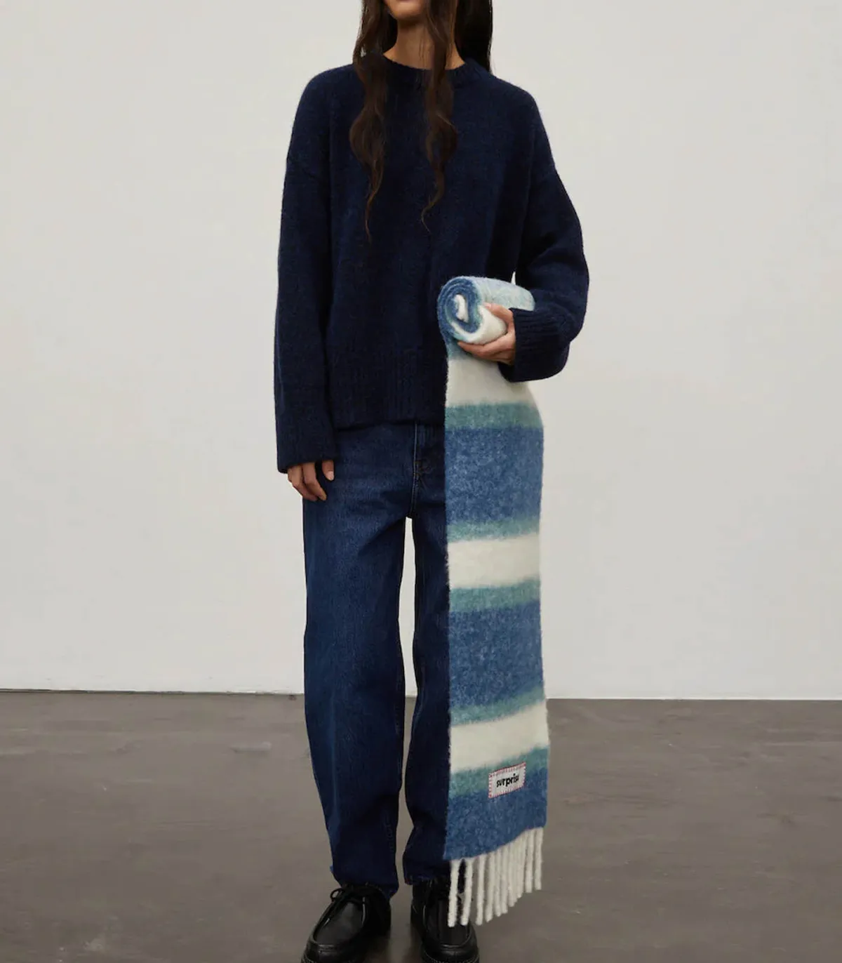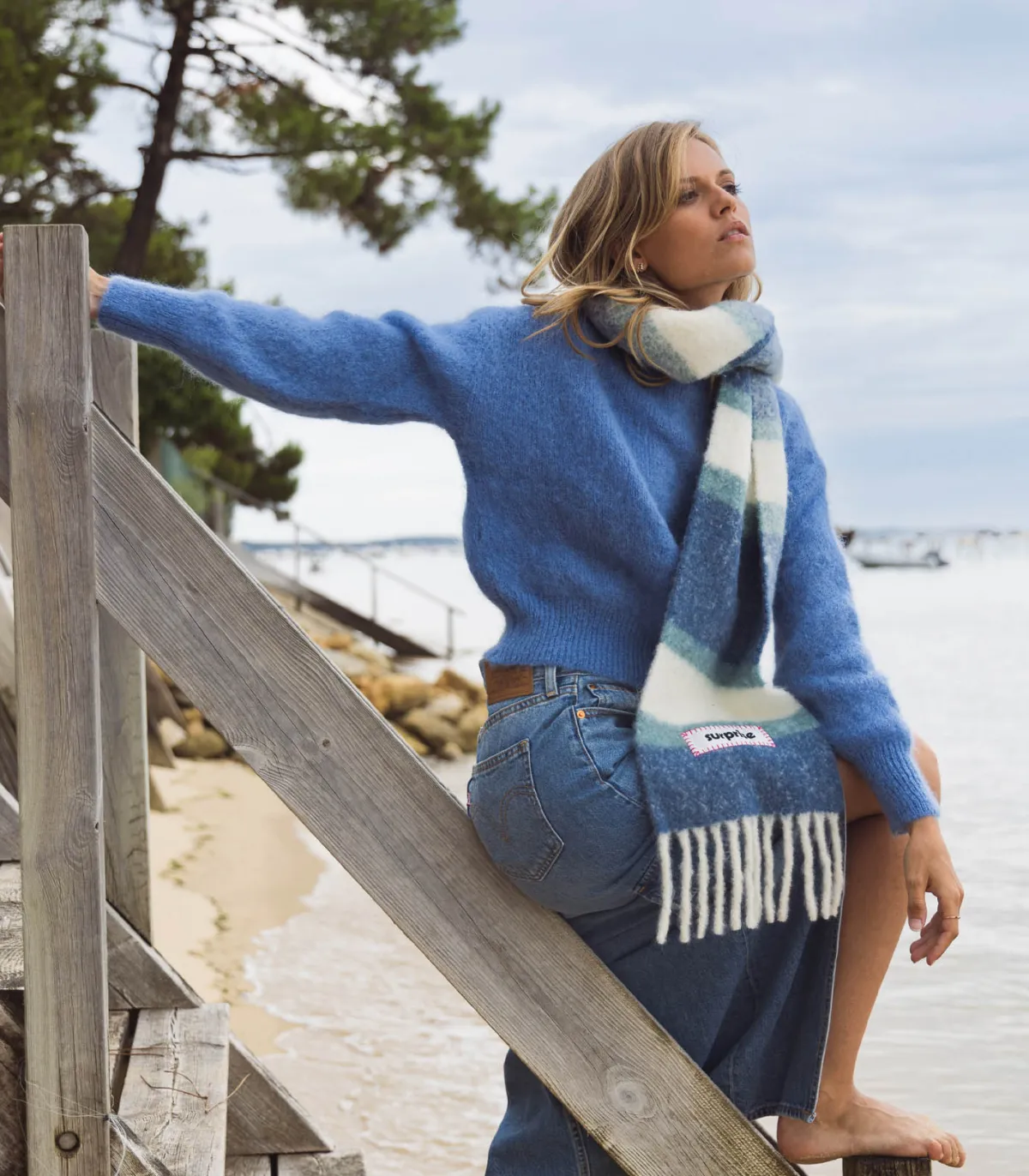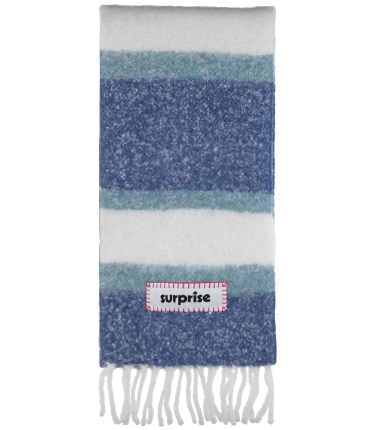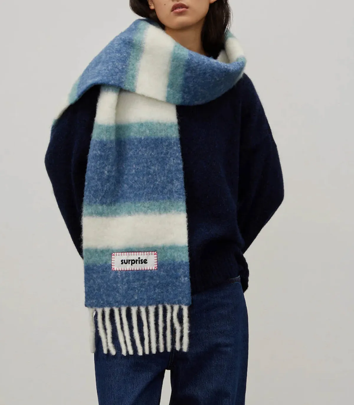 Confectionnée à base d’Alpaga, l’écharpe Surprise Paris est un accessoire idéal pour les fraîches journées d’hiver. Sa teinte écru est réhaussée de rayures dans des teintes de bleu, parfaite pour le quotidien. Douce et épaisse, c’est un vrai voile de douceur. Longues franges sur les extrémités et étiquette brandée « SURPRISE ».