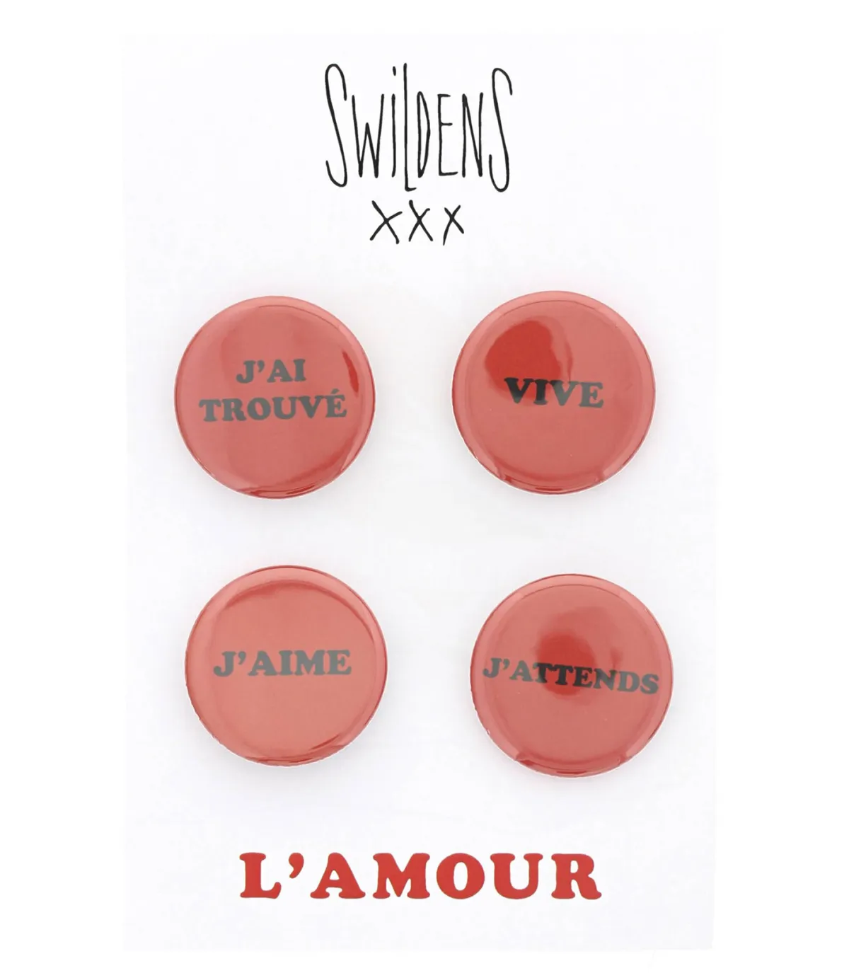 Jouez avec les mots en associant ce lot de quatre badges avec le badge L’amour de Swildens et faites passer votre message en les piquant sur un sac cabas en toile ou sur une veste.