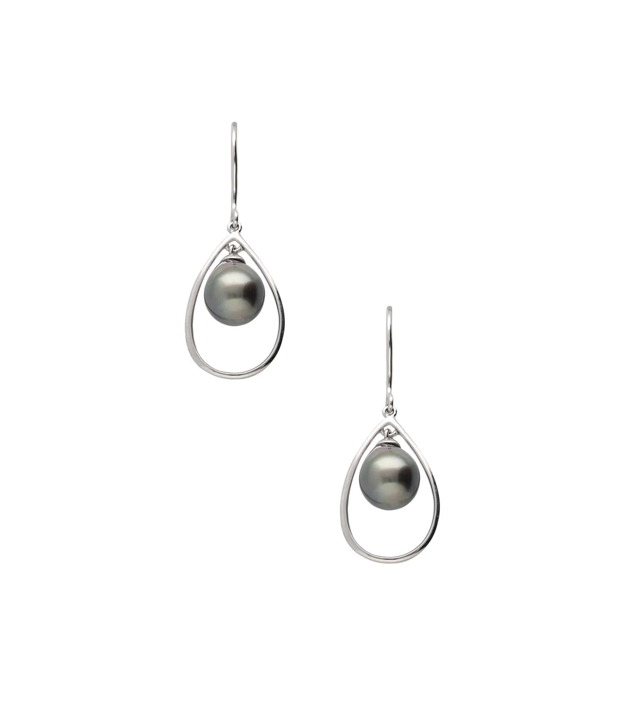 Boucles d’oreilles Anala signées Tamahiné. Ces boucles d’oreilles représentes des gouttes évidées en métal, agrémentées de perles d’eau douce pendantes à l’intérieur.