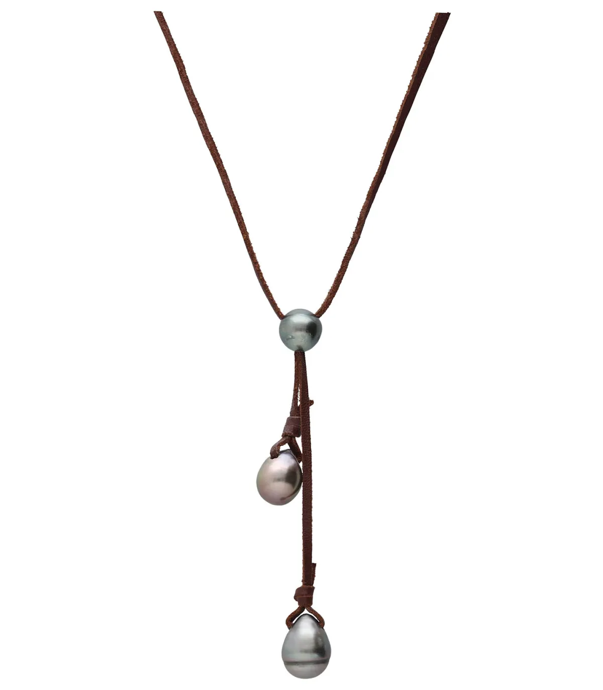 Collier Aritea 3 perles signé Tamahiné. Ce collier est monté sur un lien en cuir brun, dans une forme « Y ». Il présente une perle d’eau douce grise à l’intersection, puis se découpe en 2 liens avec des perles d’eau douce grises aux extrémités.