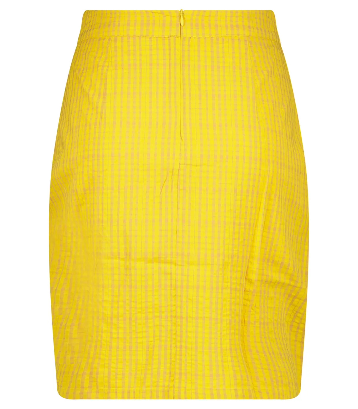 Jupe Rachel Yellow par Thinking Mu, un modèle féminin doté d’un pétillant coloris jaune doté d’un lien de serrage qui permet de porter cette jupe droite ou avec une légère fente dévoilée par des détails froncés. Fermeture zippée au dos.
