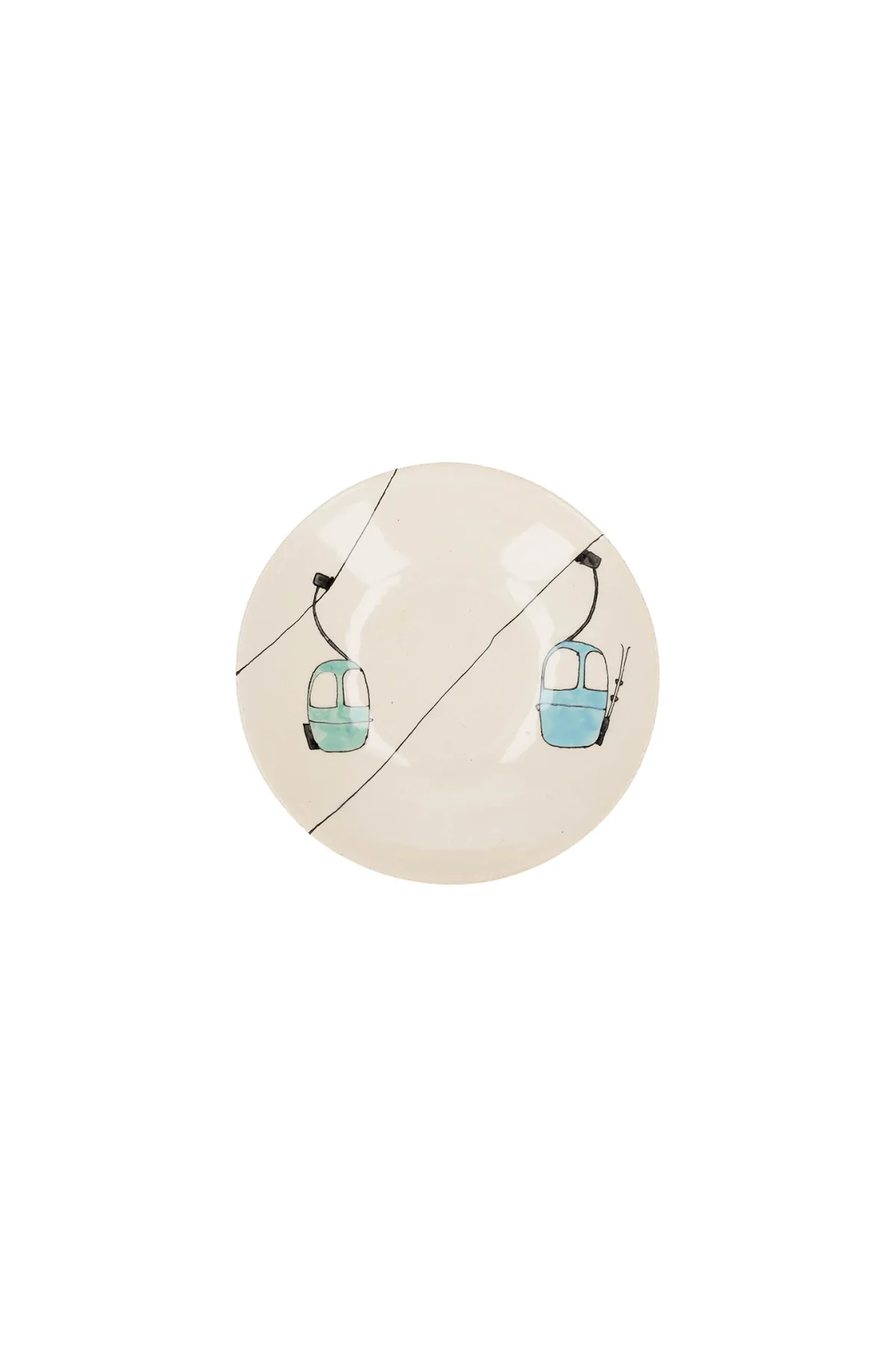 Assiette creuse en céramique beige avec deux télécabines, une verte et une bleue.