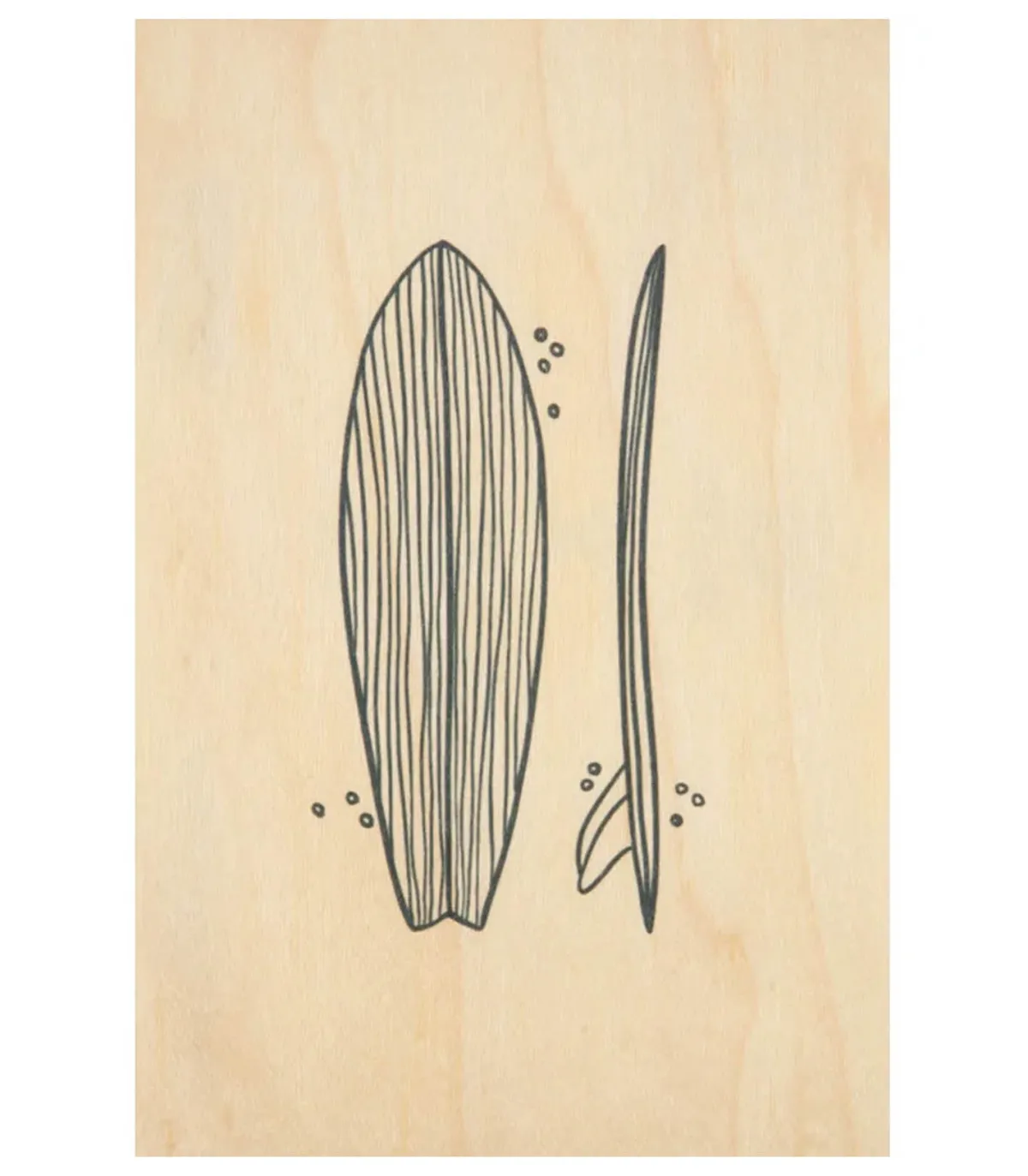Carte postale en bois Surfboards de la marque Woodhi, au design minimaliste représentant une illustration au feutre noir d’une planche de surf de face et de profile. À arrocher chez soi parmi une composition de cadres et affiches pour une décoration inspirée de l’été.