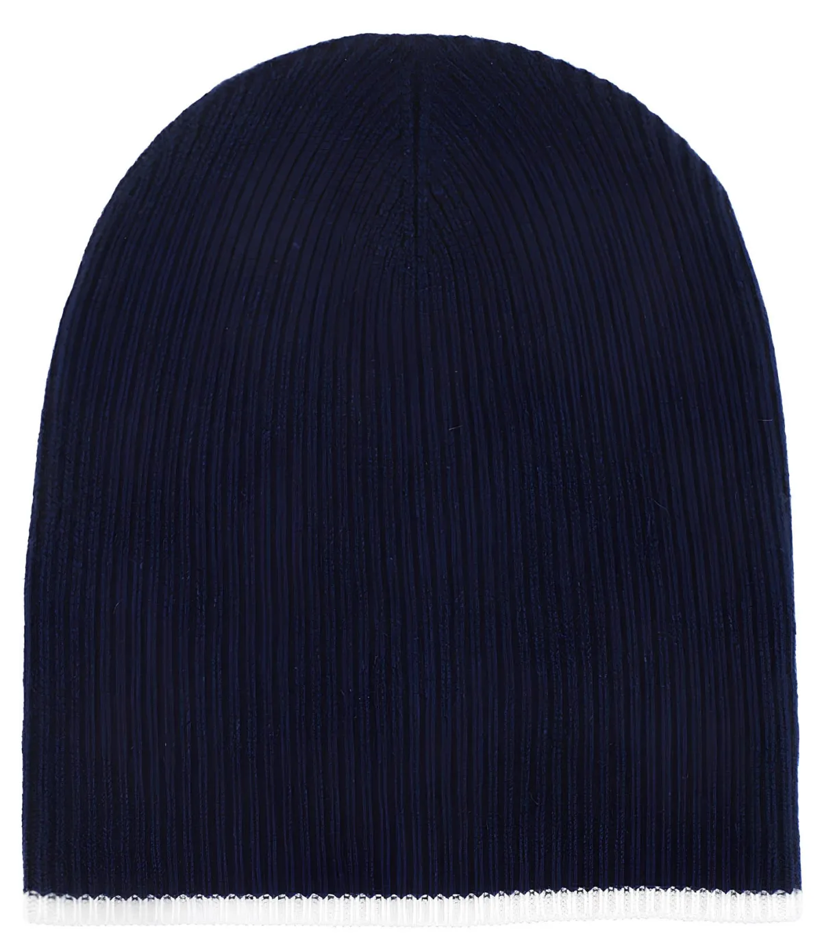 Bonnet Georgy Navy de la marque Xirena. Ce bonnet en 100% cachemire de couleur bleu marine présente un liseré contrastant beige sur le bas et rehaussera ainsi vos looks d’une touche chaleureuse.