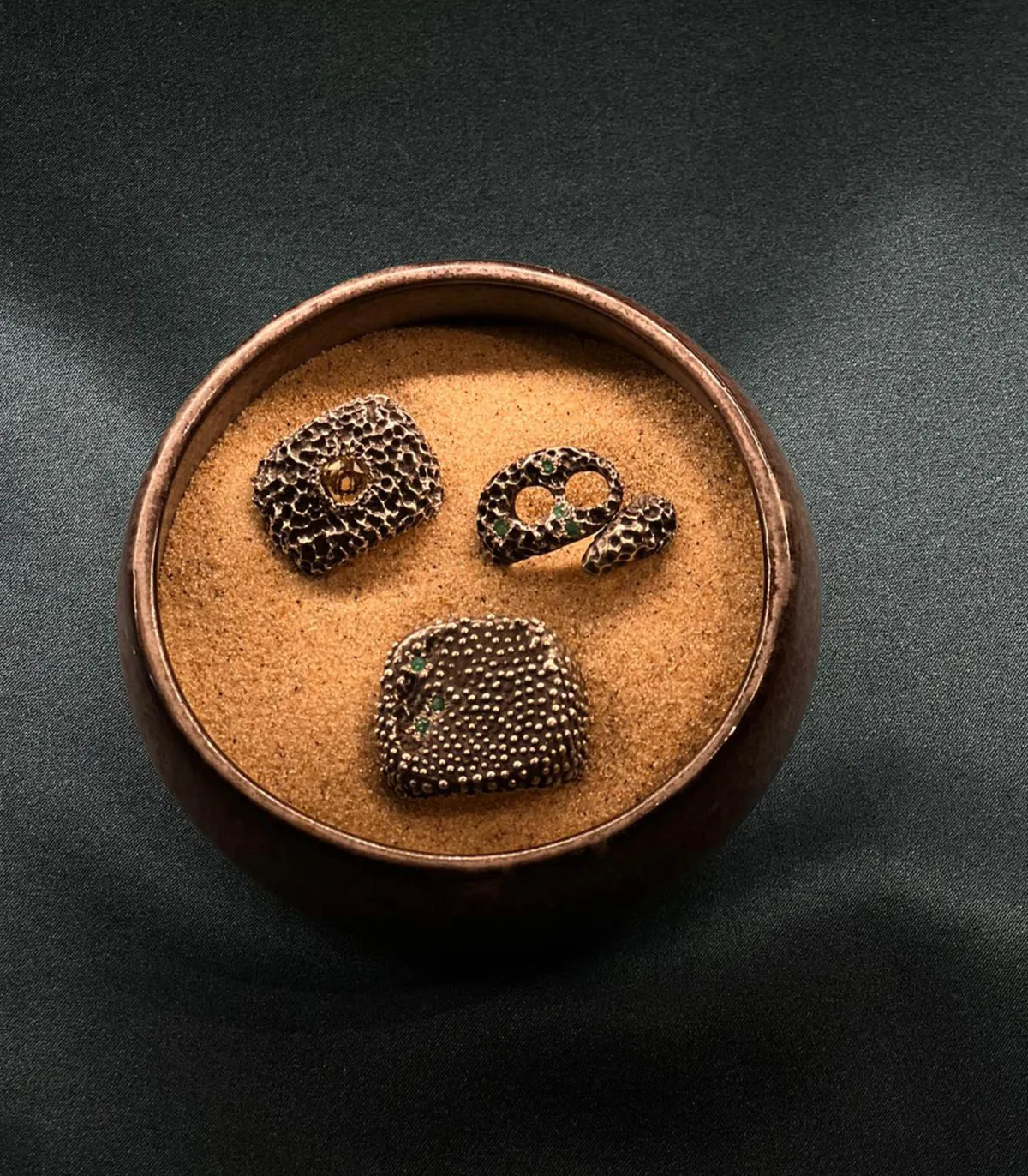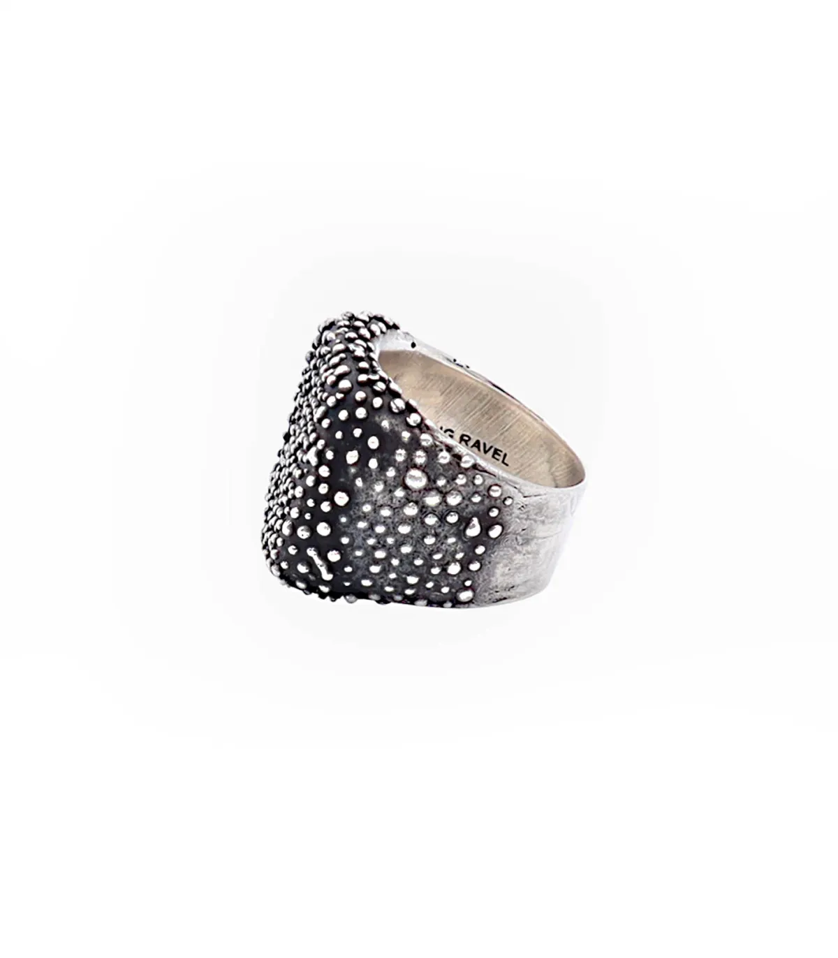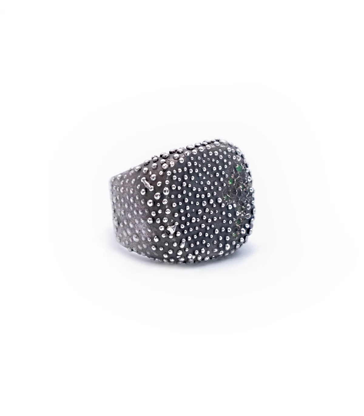 Bague Supergreen imaginée par le joaillier Ylang Ravel pour sa maison éponyme. Inspiré par une technique antique égyptienne, la granulation, il dévoile une chevalière en argent unisexe recouverte de billes d’argent et incrustée de sept émeraudes.